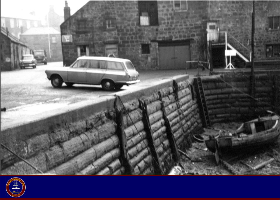Berwick Shipyard, 1970The single storey building visible to the the left of the picture housed a timber store and the shipwrights shop. The building in the foreground was used for stores. The boat you can see in the 'little dock' is the yard workboat Ladrum Ba. Photo:© Iain Havery   Copyright © 2007-2023All Rights Reerved